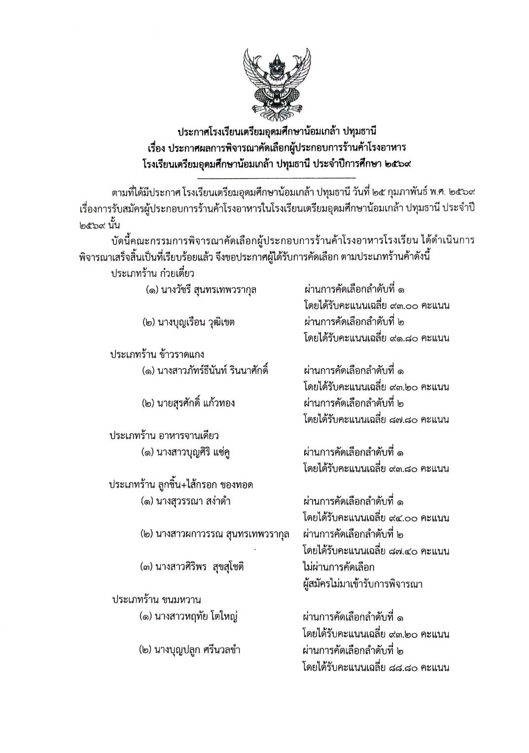 ประกาศโรงเรียนเตรียมอุดมศึกษาน้อมเกล้า ปทุมธานี เรื่อง ประกาศผลการพิจารณาผู้ประกอบการร้านค้าโรงอาหาร ปีการศึกษา 2569