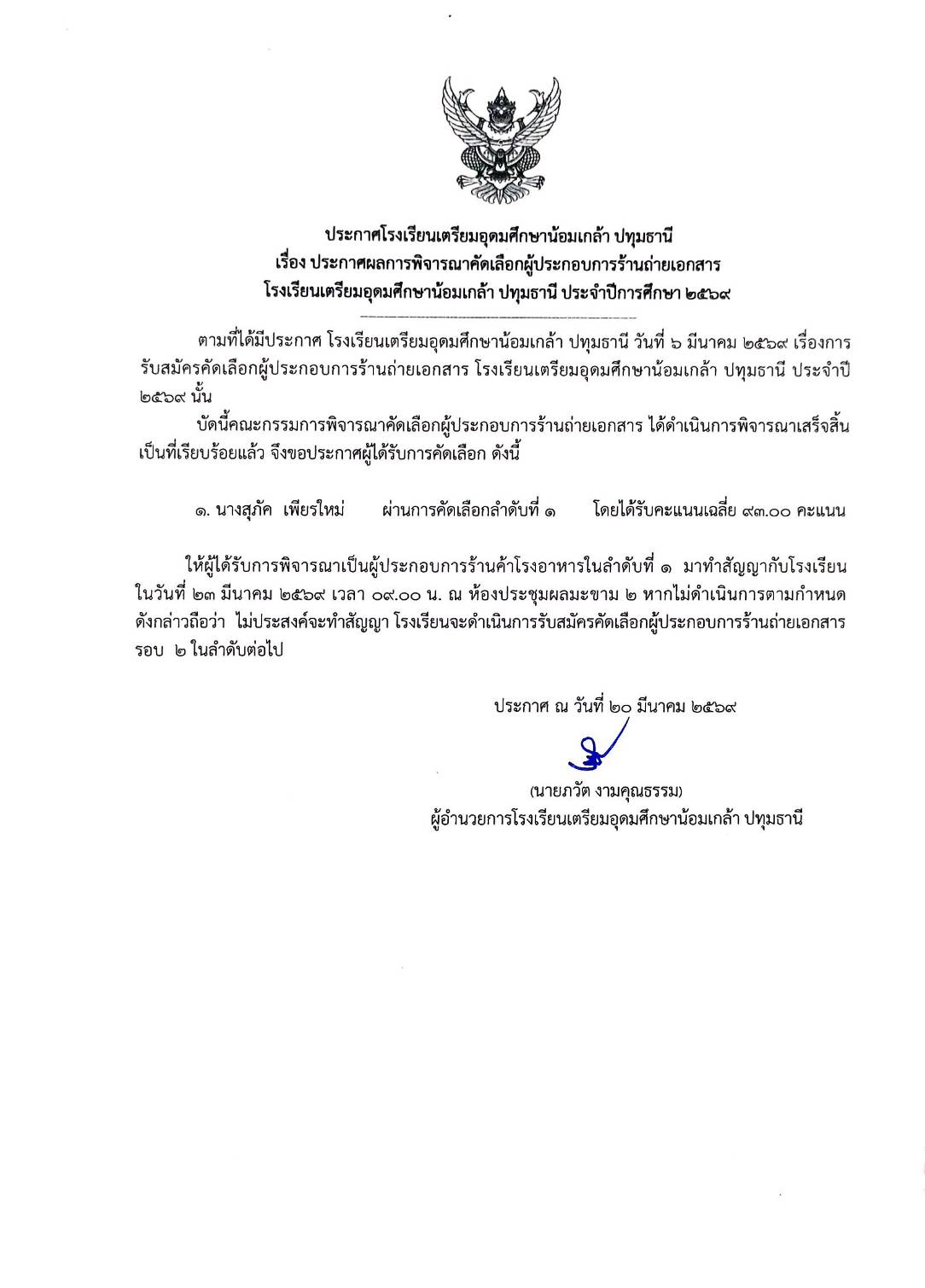 ประกาศโรงเรียนเตรียมอุดมศึกษาน้อมเกล้า ปทุมธานี เรื่อง ประกาศผลการพิจารณาผู้ประกอบการร้านถ่ายเอกสาร ปีการศึกษา 2569
