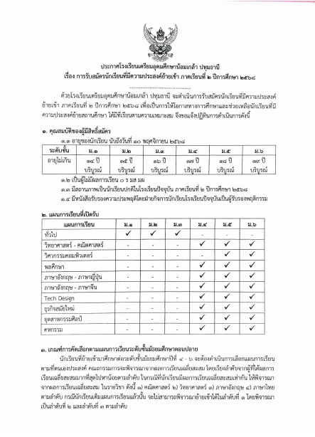 ประกาศโรงเรียนเตรียมอุดมศึกษาน้อมเกล้า ปทุมธานี เรื่อง การรับสมัครนักเรียนที่มีความประสงค์ย้ายเข้า ภาคเรียนที่ 1 ปีการศึกษา 2568