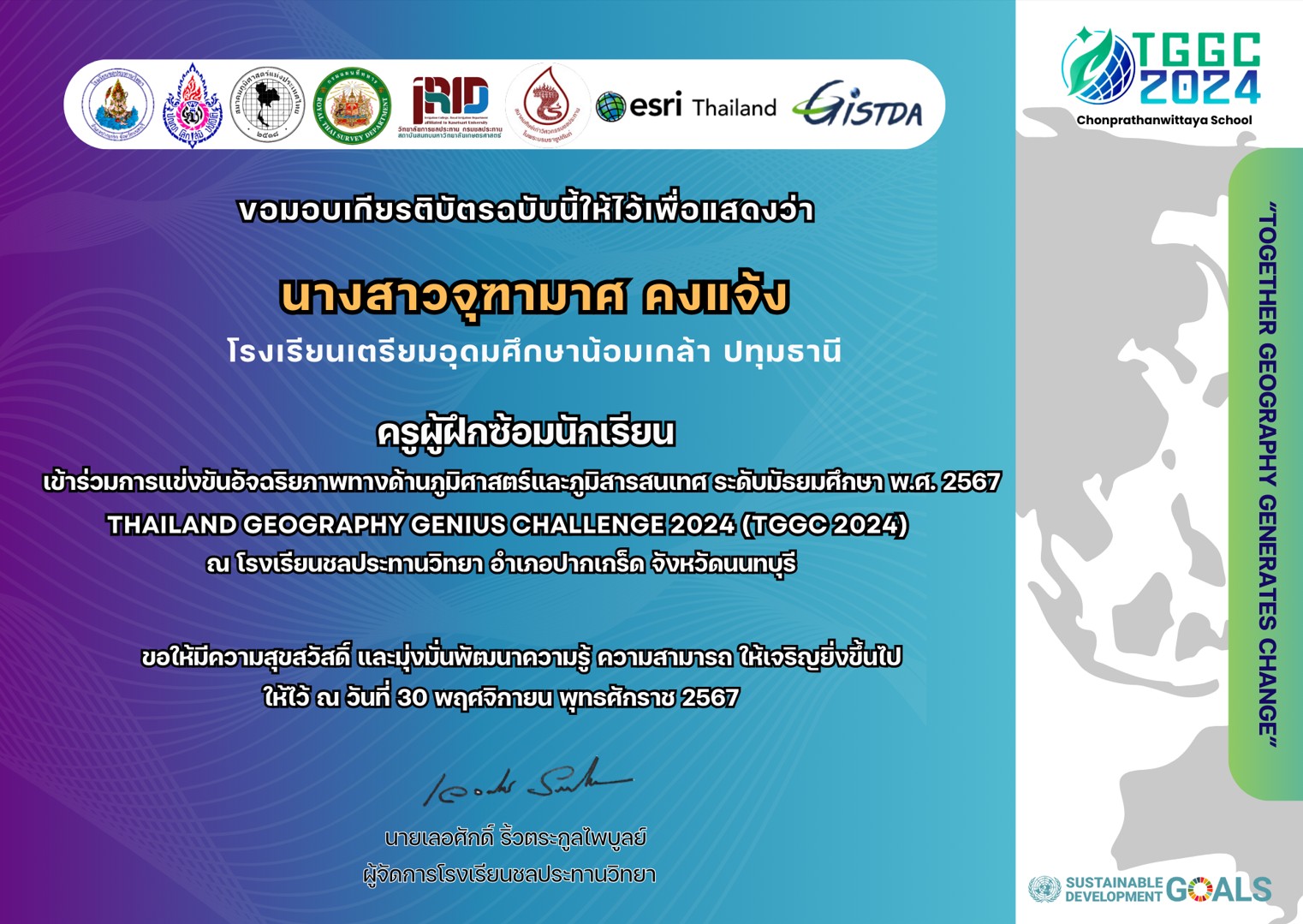 ครูผู้ฝึกซ้อมนักเรียนแข่งขันอัจริยภาพทางด้านภูมิศาสตร์และภูมิสารสนเทศ ระดับมัธยมศึกษา พ.ศ.2567 THAILAND GEOGRAPHY GENIUS CHALLENGE 2024 (TGGC 2024 ณ โรงเรียนชลประทานวิทยา อำเภอปากเกร็ด จังหวัดนนทบุรี) |